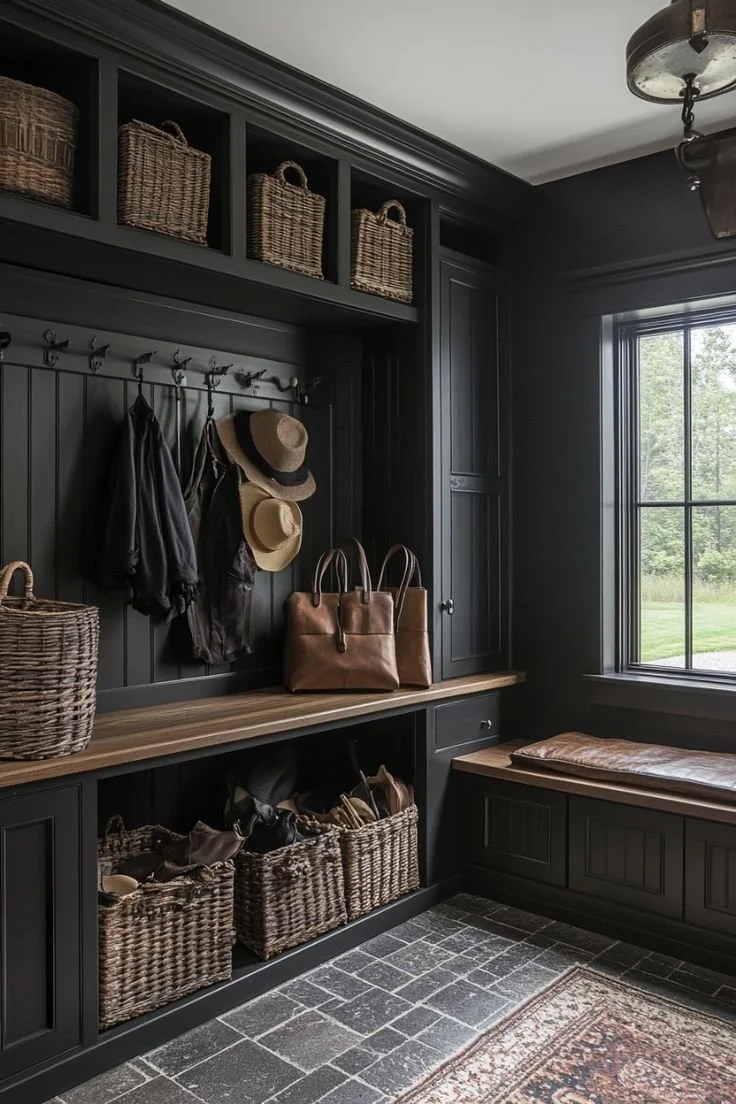 I love slate because it’s naturally textured, which makes it slip resistant (perfect when you’re juggling kids, bags, and hot coffee all at once). The earthy tones add depth, and it pairs beautifully with built-in wooden benches.