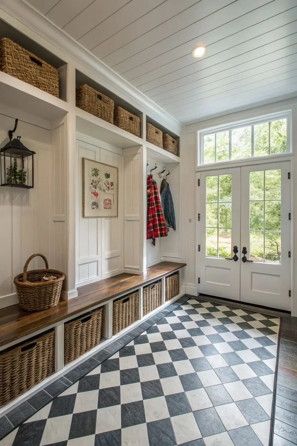 I have to admit, checkerboard makes me swoon every time. There’s something about black-and-white ceramic tile in a mudroom that feels both classic and fresh. It’s a look that never goes out of style and instantly adds visual interest to an otherwise functional space.