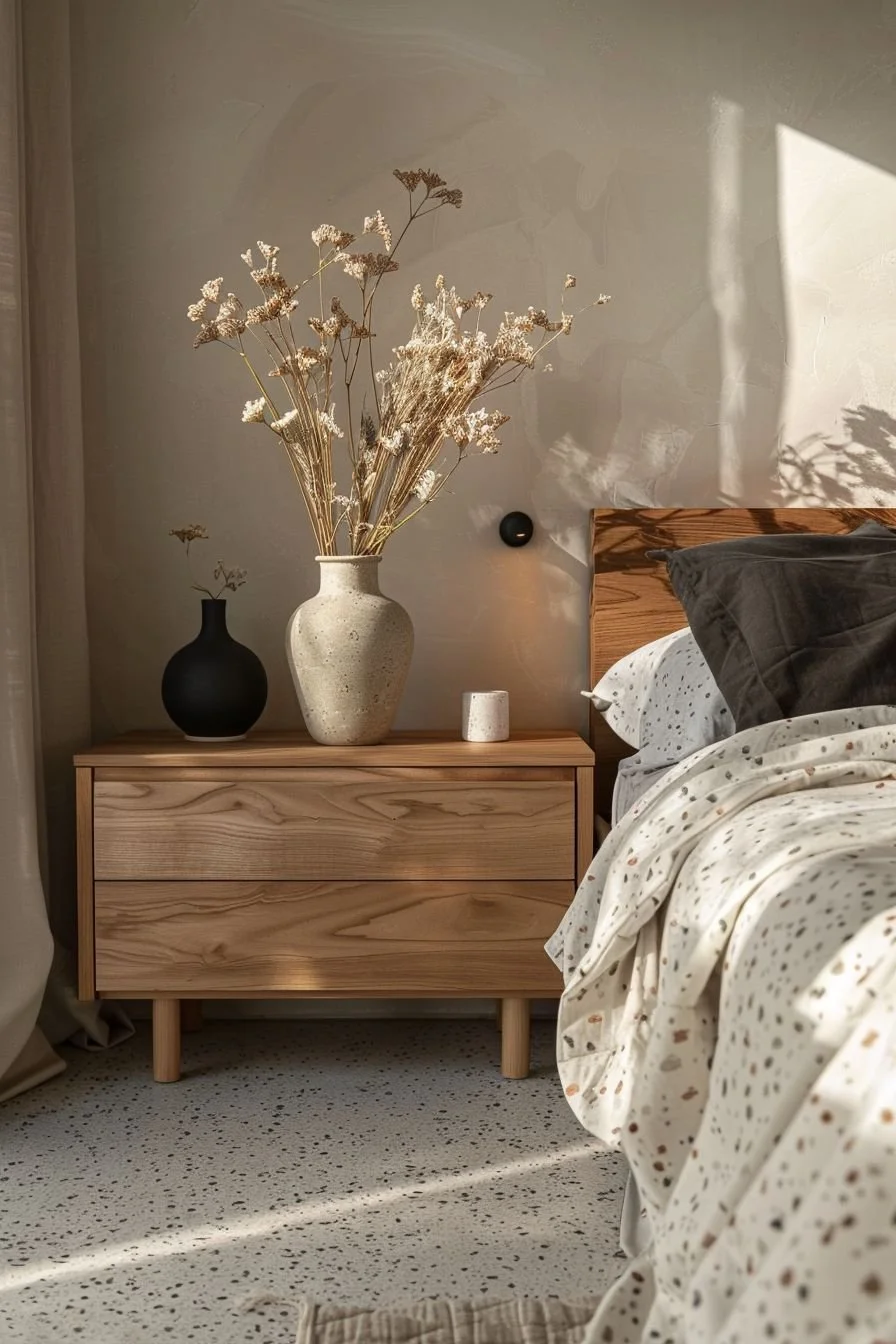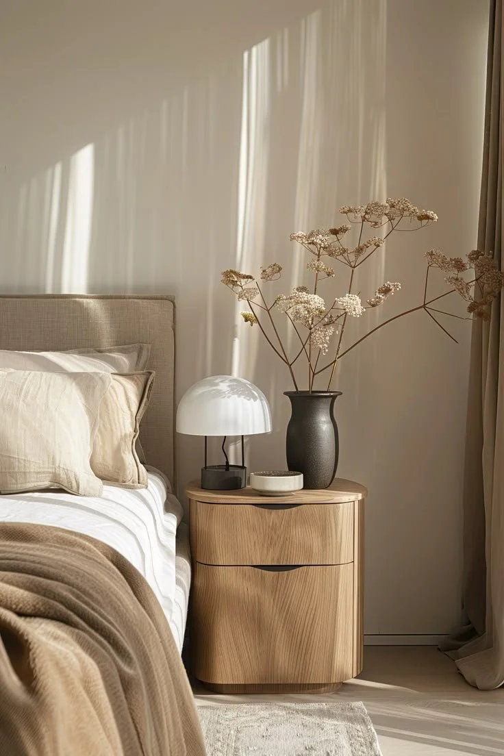 A styled nightstand is less about stuff and more about balance. Vary the height of your objects — pair a tall lamp with stacked books, or place a low bowl beside a taller vase. Mix textures, too — wood trays, ceramic bowls, glass candles. This creates a layered look that feels effortless but intentional.